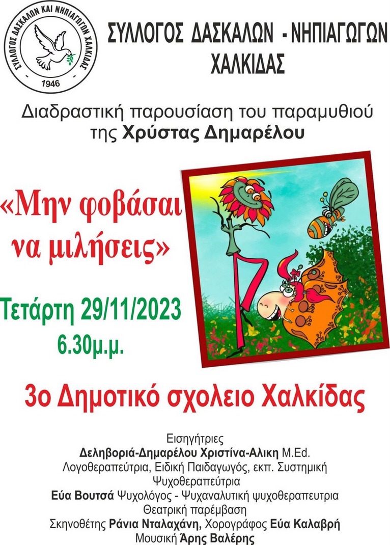 Το Δ.Σ. του Συλλόγου Δασκάλων και Νηπιαγωγών Χαλκίδας ,την Τετάρτη 29 Νοεμβρίου, στις 6:30 το απόγευμα, στην αίθουσα εκδηλώσεων του 3ου Δημοτικού Σχολείου Χαλκίδας , παρουσιάζει το παιδικό παραμύθι της Χρύστας Δημαρέλου, με τίτλο «Μην φοβάσαι να μιλήσεις» .