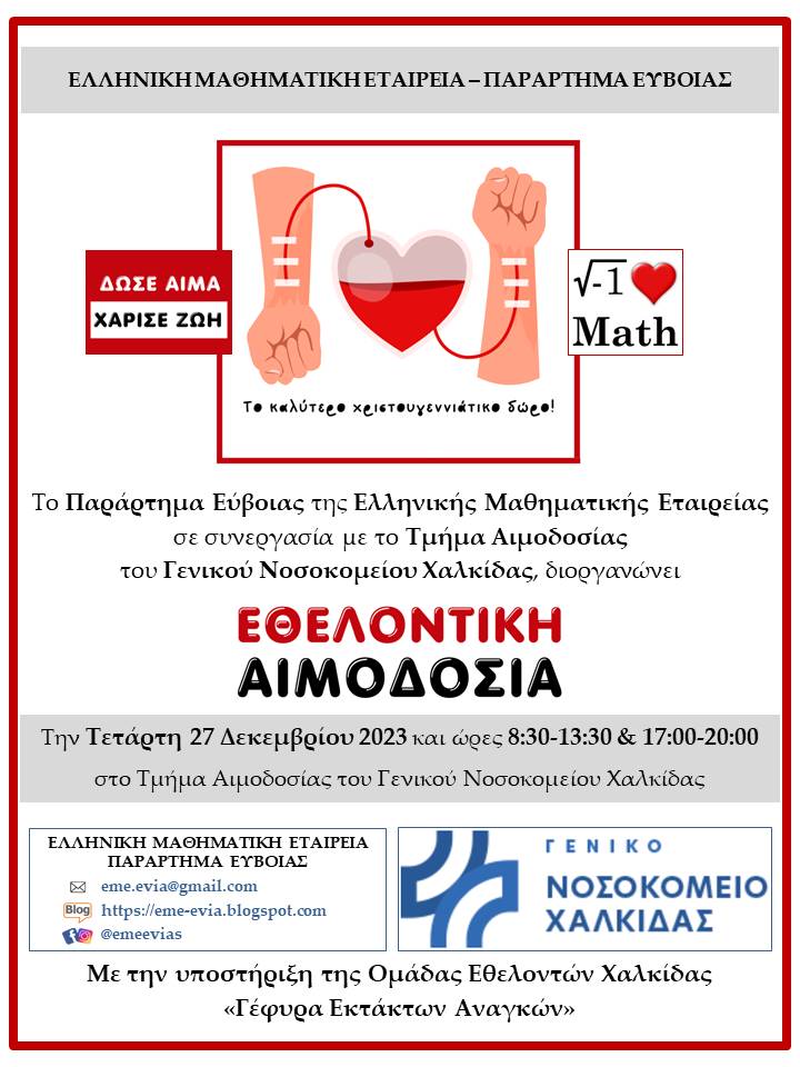Το παράρτημα Εύβοιας της Ελληνικής Μαθηματικής Εταιρείας διοργανώνει εθελοντική αιμοδοσία, σε συνεργασία με το Τμήμα Αιμοδοσίας του Γενικού