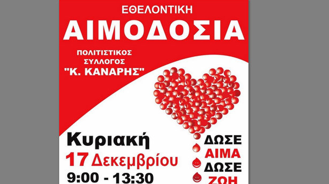 Ο Πολιτιστικός Σύλλογος Ερέτριας "Κ. Κανάρης" διοργανώνει εθελοντική αιμοδοσία την Κυριακή 17 Δεκεμβρίου, από τις 9 το πρωί μέχρι την 1:30 το μεσημέρι, στα γραφεία του Συλλόγου.