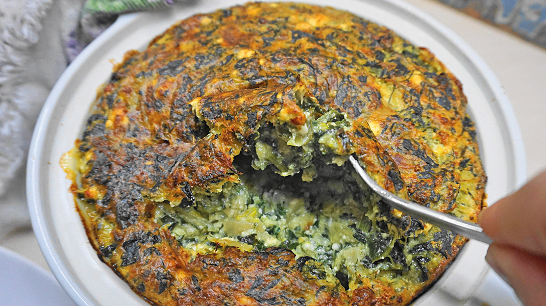 Χτυπάμε τα αβγά μαζί με τον άνιθο, το αλάτι και το πιπέρι, προσθέτουμε τη φέτα και το μπέικιν πάουντερ, ανακατεύουμε και αδειάζουμε στο σπανάκι.