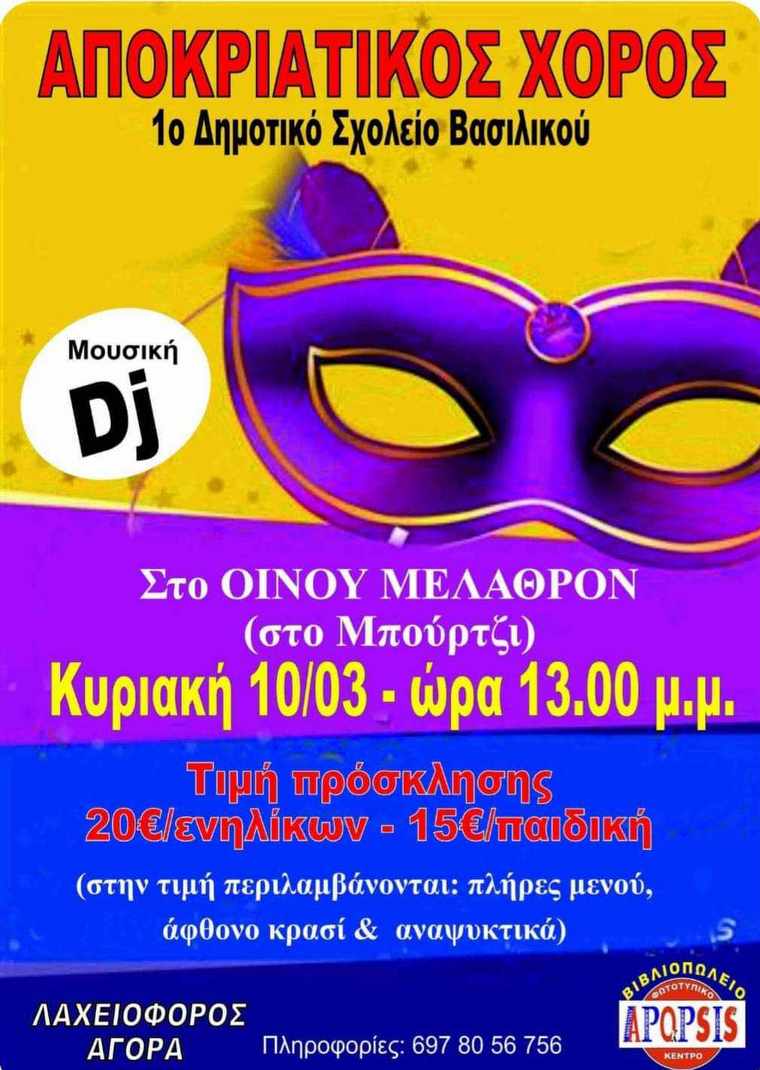Ο Σύλλογος Γονέων και Κηδεμόνων του 1ου Δημοτικού Σχολείου Δημοτικού Βασιλικού διοργανώνει Αποκριάτικο χορό, την Κυριακή 11 Φεβρουαρίου, στη 1 το μεσημέρι, στο κέντρο "Οίνου Μέλαθρον", στο Μπούρτζι.