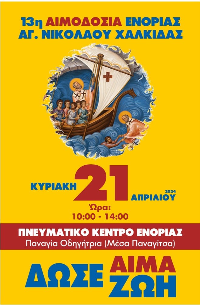 Την Κυριακή 21 Απριλίου, από τις 10 το πρωί μέχρι τις 2 το μεσημέρι, θα πραγματοποιηθεί η 13η Εθελοντική Αιμοδοσία στην Ενορία του Αγίου Νικολάου Χαλκίδας.