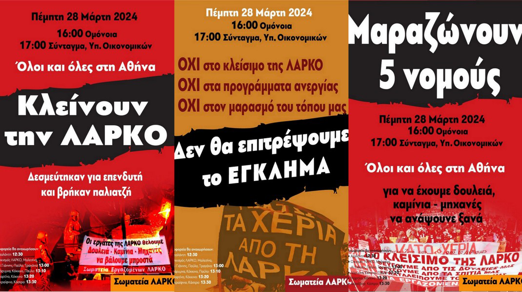 Η κορύφωση του αγώνα θα γίνει την Πέμπτη 28 Μαρτίου. Στις 4 το απόγευμα, εργαζόμενοι απ’ όλα τα σωματεία της ΛΑΡΚΟ θα συγκεντρωθούν στην πλατεία Ομονοίας, στην Αθήνα.