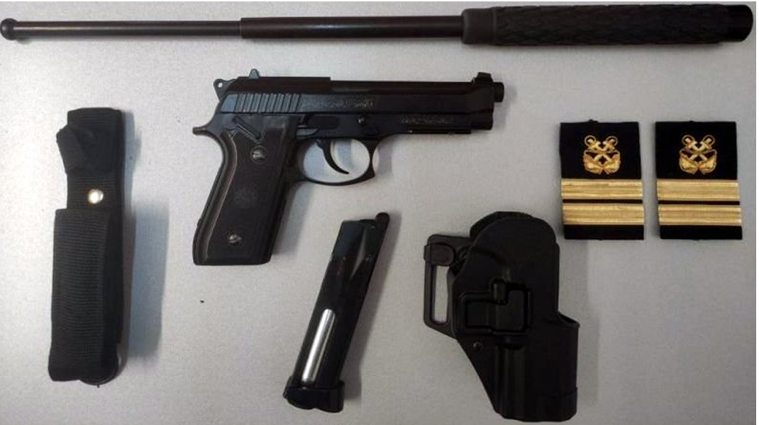Εντός του σκάφους στο οποίο διέμενε, βρέθηκε μία πλαστική θήκη μέσης πιστολιού, ενώ διαπιστώθηκε ότι φορούσε μέσα από το σακάκι του, λευκό πουκάμισο με επωμίδες, στις οποίες έφερε τον βαθμό του Ανθυποπλοιάρχου Λιμενικού Σώματος.
