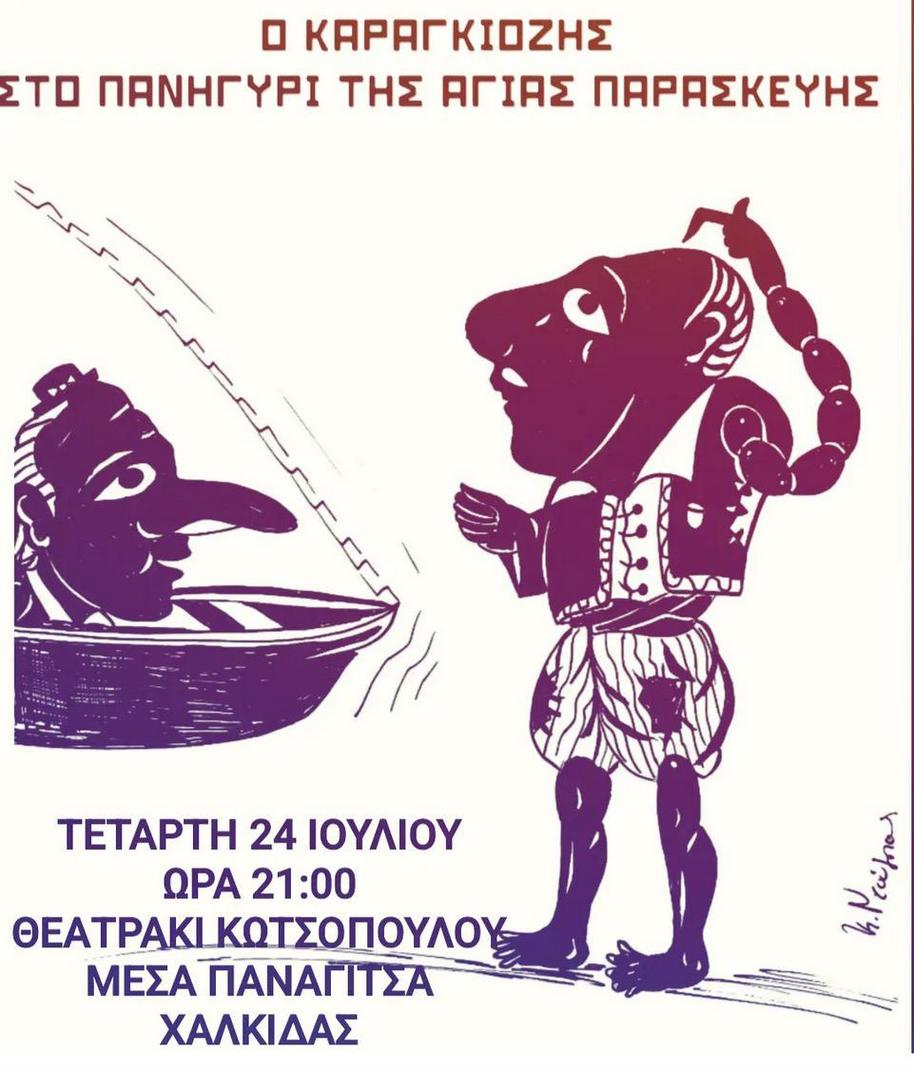 Την Τετάρτη 24 Ιουλίου, στις 9 το βράδυ, θα παρουσιαστεί άλλη μια παράσταση του Θεάτρου Σκιών, με το οποίο διασκεδάζουν γενιές και γενιές Ελλήνων, με το επίκαιρο θέμα: " Ο Καραγκιόζης στο παζάρι της Αγίας Παρασκευής".