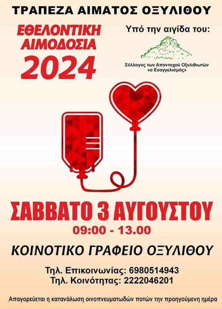 Η αιμοδοσία θα πραγματοποιηθεί για την ενίσχυση της Τράπεζας Αίματος Οξυλίθου. Τηλέφωνο επικοινωνίας: 6980514943. Τηλέφωνο κοινότητας: 222046201.