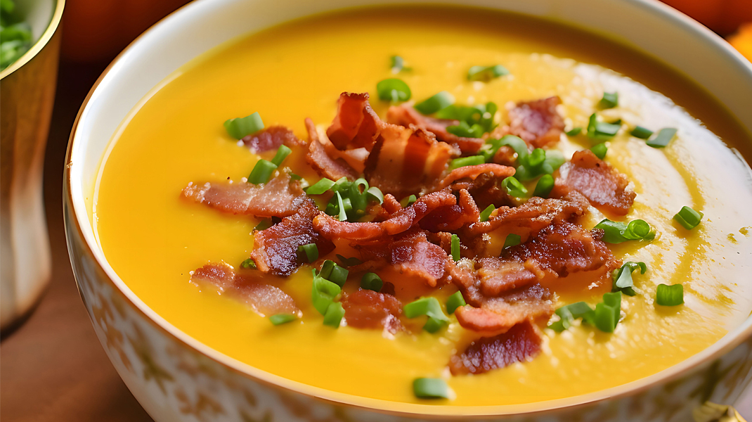 Σιγοβράζουμε για 2-3 λεπτά ακόμη και σερβίρουμε ζεστή τη σούπα, αφού έχουμε γαρνίρει από πάνω το μπέικον.