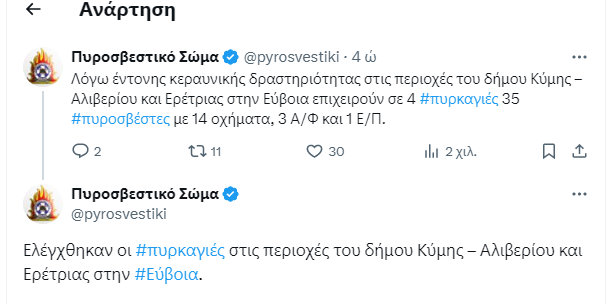 Τέσσερις φωτιές ξέσπασαν το πρωί της Παρασκευής 30 Αυγούστου, εξαιτίας πτώσης κεραυνών σε περιοχές των Δήμων Διρφύων- Μεσσαπίων, Ερέτριας και Κύμης - Αλιβερίου.