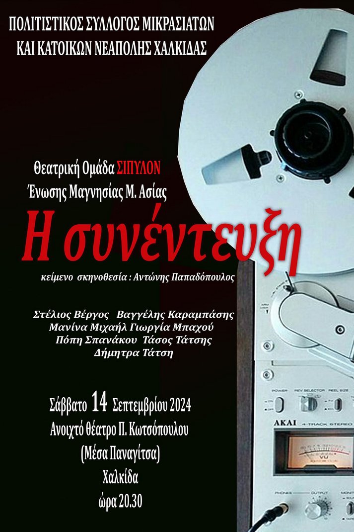 - Το Σάββατο 14 Σεπτεμβρίου, στις 8:30 το βράδυ, στο Θέατρο Κωτσόπουλου, στη Μέσα Παναγίτσα, θεατρική παράσταση από την Ομάδα Σίπυλον Ένωσης Μαγνησίας Μικράς Ασίας, με το έργο " Η συνέντευξη", σε κείμενο και σκηνοθεσία Αντώνη Παπαδόπουλου