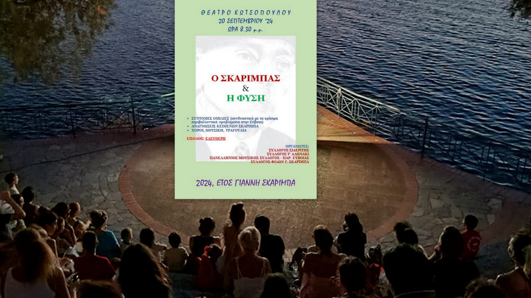 Στο πλαίσιο του "έτους Γιάννη Σκαρίμπα 2024", την Παρασκευή 20 Σεπτεμβρίου, στις 8:30 το βράδυ, στο Θέατρο Κωτσόπουλου, στη Μέσα Παναγίτσα, θα πραγματοποιηθεί εκδήλωση, με θέμα " Ο Σκαρίμπας και η φύση".