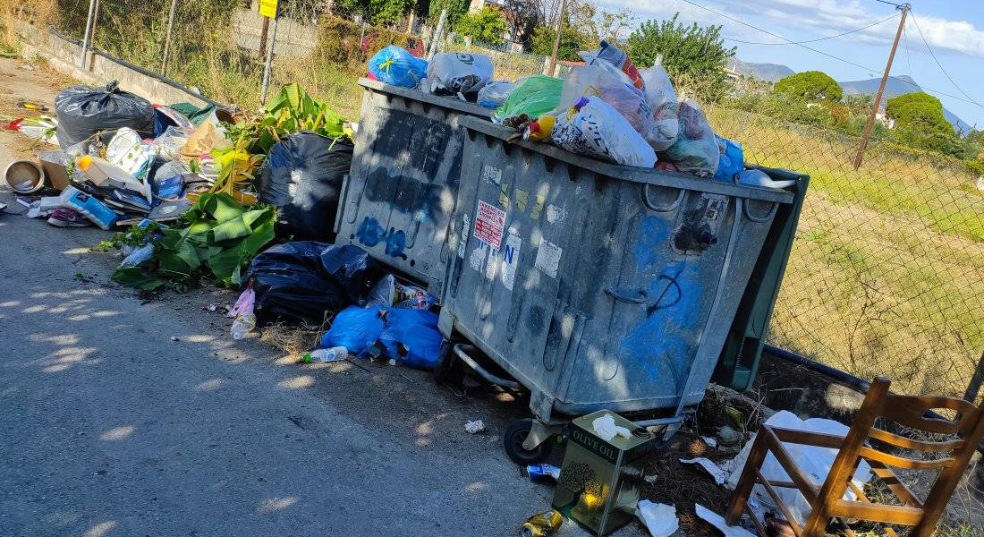 Η φωτογραφία είναι από την οδό Δ. Πάττα, όπου οι παλιοί κάδοι έχουν ξεχειλύσει και τα σκουπίδια στιβάζονται δίπλα τους.