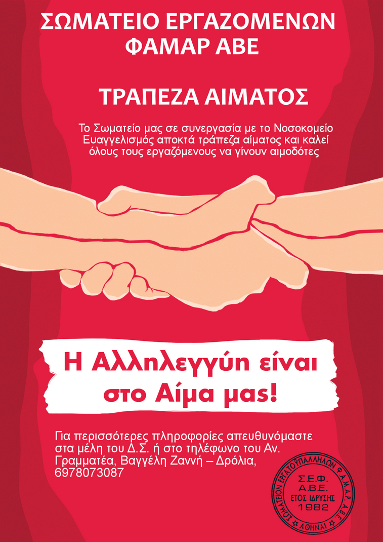 Το Σωματείο Εργαζομένων στην εταιρεία ΦΑΜΑΡ ΑΒΕ, σε συνεργασία με το Νοσοκομείο Ευαγγελισμός, αποκτά τράπεζα αίματος. Το Δ.Σ. του Σωματείου καλεί όλους τους εργαζόμενους να γίνουν αιμοδότες!