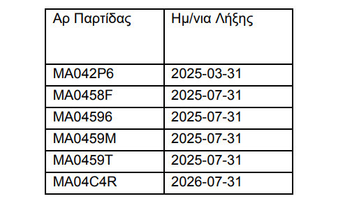 Οι παρτίδες που ανακαλούνται είναι οι εξής: