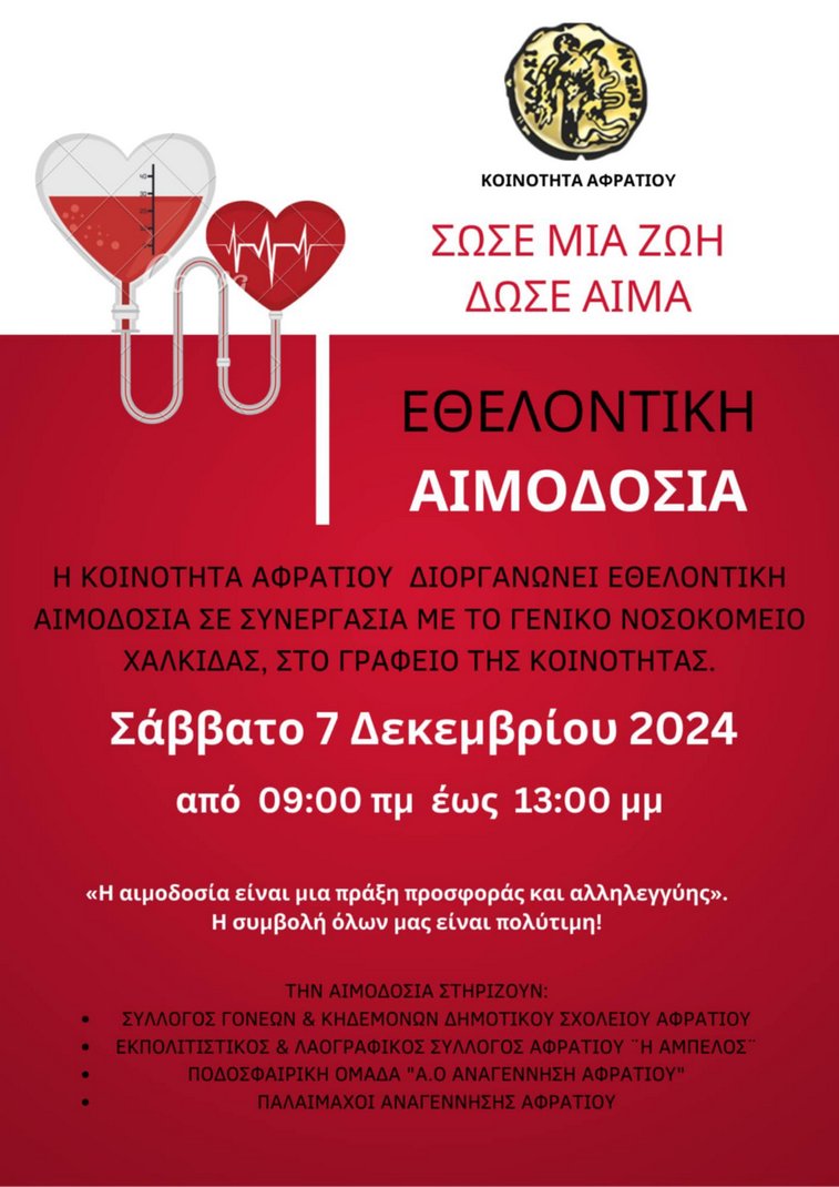 Το Συμβούλιο της Δημοτικής Κοινότητας Αφρατίου, σε συνεργασία με το Γενικό Νοσοκομείο Χαλκίδας και με τη στήριξη τοπικών φορέων και συλλόγων, διοργανώνουν εθελοντική αιμοδοσία το Σάββατο 7 Δεκεμβρίου.