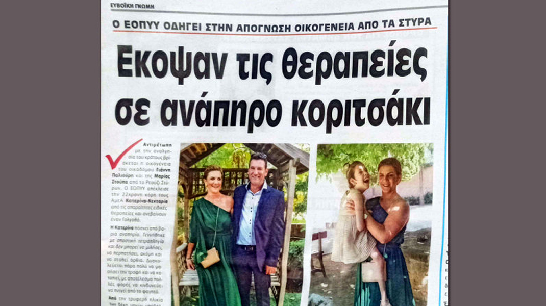Χρειάστηκε να καταθέσει ερώτηση στη Βουλή η Κατερίνα Καζάνη και να γίνει πρωτοσέλιδο ρεπορτάζ στην εφημερίδα «Ευβοϊκή Γνώμη», για να εγκριθούν οι κρίσιμες θεραπείες (φυσικοθεραπείες, λογοθεραπείες και ψυχοθεραπείες) για την 22χρονη Κατερίνα από τα Στύρα της Ευβοίας.