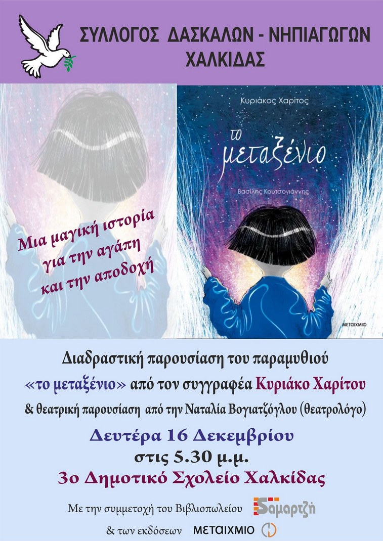 Ο Σύλλογος Δασκάλων και Νηπιαγωγών Χαλκίδας παρουσιάζει τη Δευτέρα 16 Δεκεμβρίου, στις 5:30 το απόγευμα, στο 3ο Δημοτικό Σχολείο Χαλκίδας το βιβλίο του Κυριάκου Χαρίτου «το μεταξένιο».