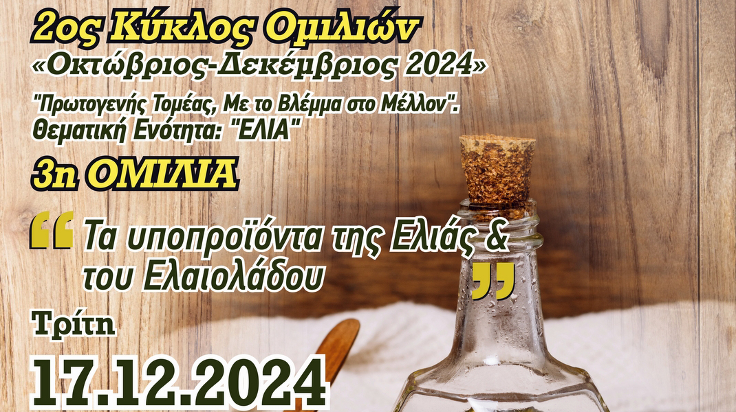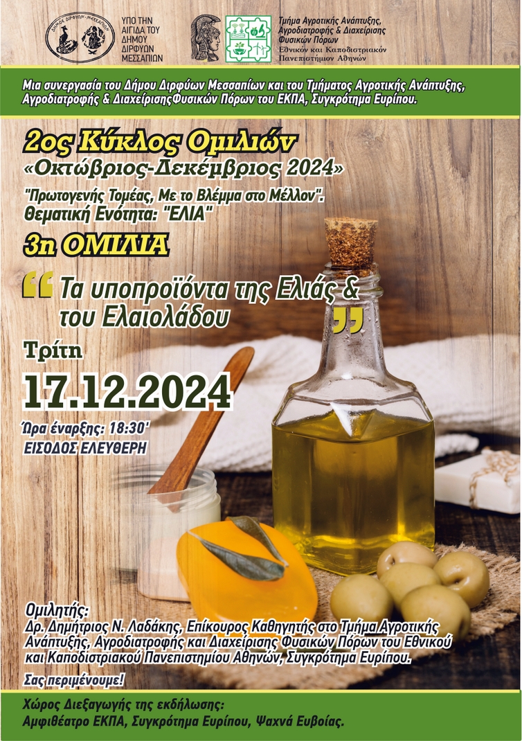 Η εκδήλωση θα πραγματοποιηθεί την Τρίτη 17 Δεκεμβρίου, στις 6:30 το απόγευμα, στο αμφιθέατρο του Πανεπιστημίου (Συγκρότημα Ευρίπου ΕΚΠΑ), στα Ψαχνά και το θέμα της ομιλίας είναι: " Τα υποπροϊόντα της ελιάς και του ελαιολάδου".
