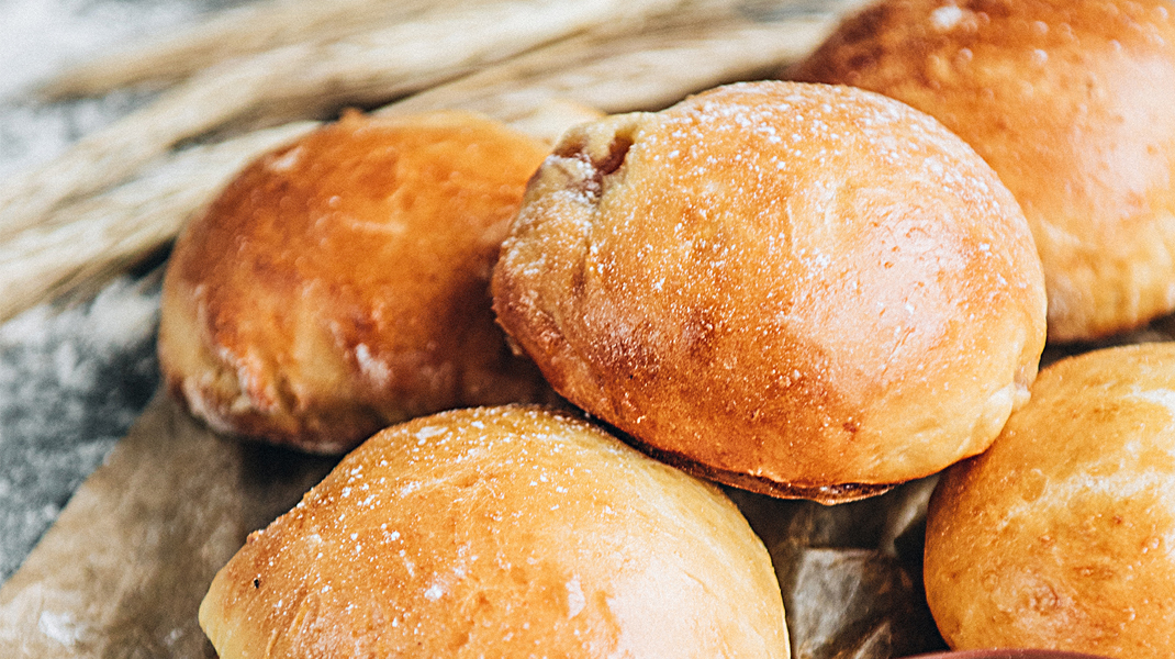 Στη συνέχεια, χωρίζουμε τη ζύμη σε περίπου 10 κομμάτια και πλάθουμε μπαλάκια. Τα τοποθετούμε σε ένα ταψί, στο οποίο έχουμε στρώσει χαρτί ψησίματος, τα σκεπάζουμε πάλι και τα αφήνουμε να φουσκώσουν ξανά για περίπου 30 λεπτά.