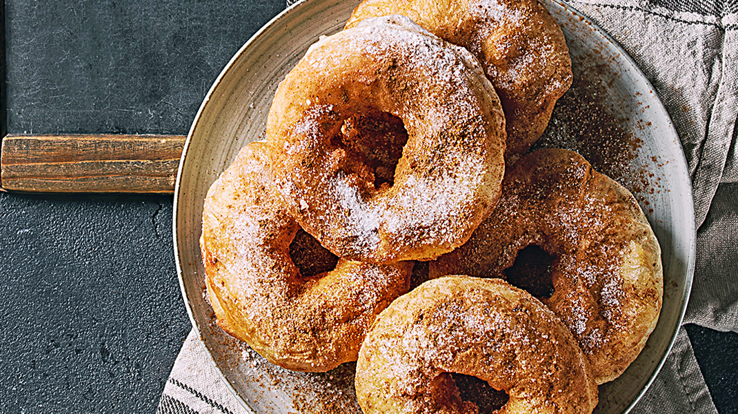 Τοποθετούμε σε πιατέλα με απορροφητικό χαρτί και στη συνέχεια, περνάμε τα ντόνατς από το μείγμα ζάχαρης-κανέλας.