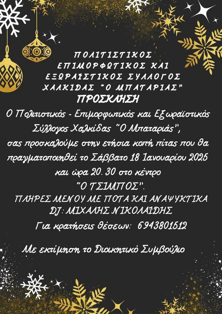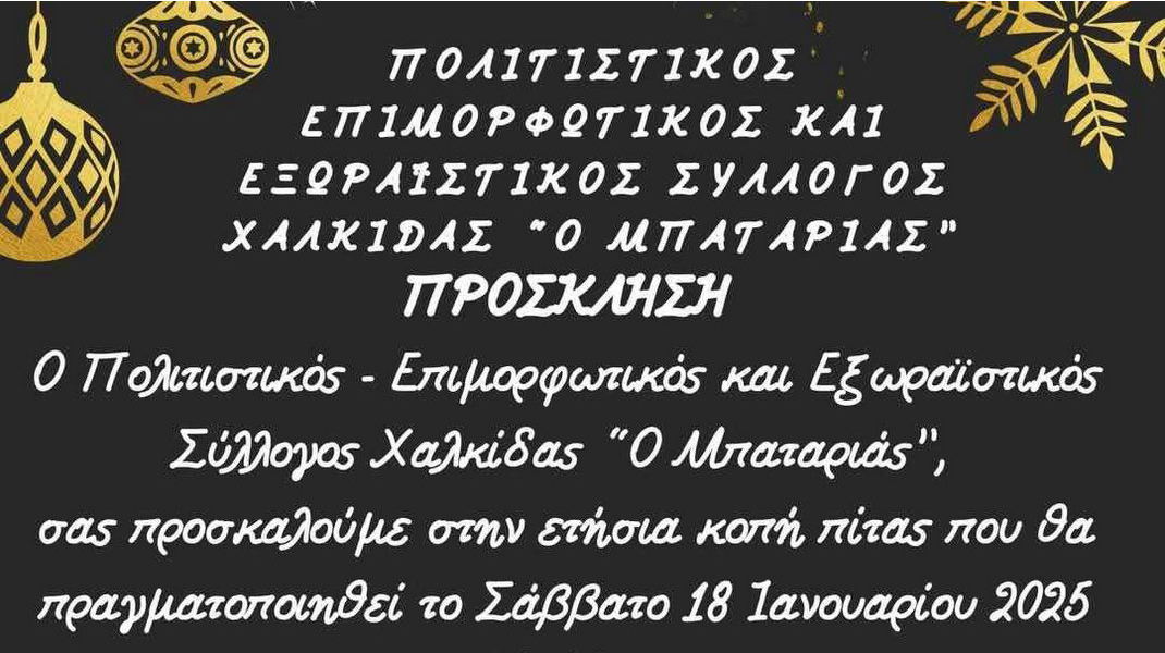 Ο Πολιτιστικός - Επιμορφωτικός και Εξωραϊστικός Σύλλογος Χαλκίδας " Ο Μπαταριάς" θα πραγματοποιήσει εκδήλωση για την κοπή της πρωτοχρονιάτικης βασιλόπιτας.