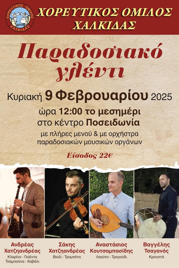 Ο Χορευτικός Όμιλος Χαλκίδας διοργανώνει παραδοσιακό γλέντι, με ορχήστρα παραδοσιακών μουσικών οργάνων, την Κυριακή 9 Φεβρουαρίου, στις 12 το μεσημέρι, στο κέντρο "Ποσειδωνία", στην περιοχή της Κανήθου.