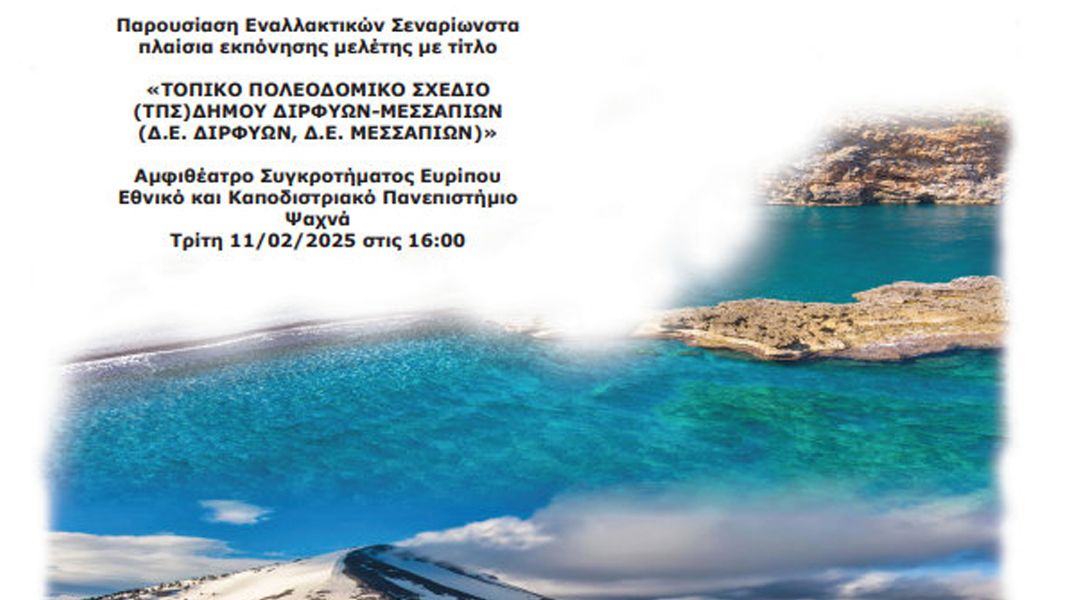 Tην Τρίτη 11 Φεβρουαρίου, στις 4 το απόγευμα, στο Αμφιθέατρο Συγκροτήματος Ευρίπου του Εθνικού και Καποδιστριακού Πανεπιστημίου (Ψαχνά Ευβοίας) θα πραγματοποιηθεί η παρουσίαση του τοπικού πολεοδομικού σχεδίου (ΤΠΣ) του Δήμου Διρφύων Μεσσαπίων.