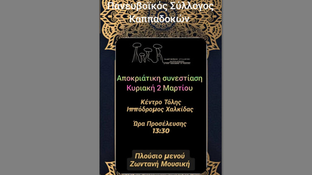 Μετά την αναβληθείσα εκδήλωση του Ιανουαρίου, λόγω πένθους, το Δ.Σ. του Πανευβοϊκού Συλλόγου Καππαδοκών ο "Άγιος Ιωάννης ο Ρώσος", προσκαλεί τα μέλη και τους φίλους του στο αποκριάτικο γλέντι του.