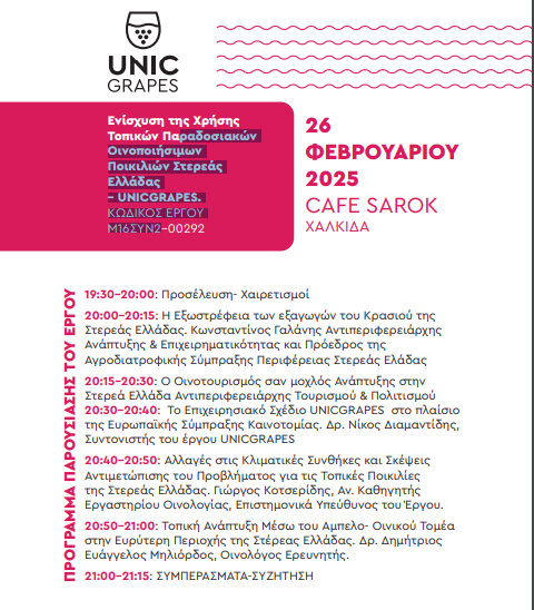 Η Αγροδιατροφική Σύμπραξη Στερεάς Ελλάδας, σε συνεργασία με το Γεωπονικό Πανεπιστήμιο, διοργανώνει εκδήλωση για τα εκλεκτά κρασιά της Στερεάς Ελλάδας.