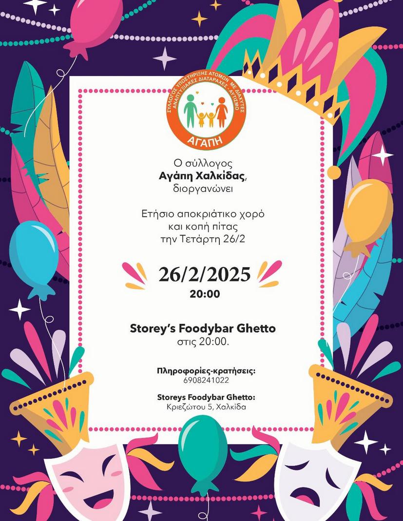 Ο Σύλλογος Αγάπη Χαλκίδας για άτομα με αυτισμό και ειδικές ανάγκες, ακυρώνει τον χορό του που είχε προγραμματιστεί στις 28 Φεβρουαρίου στο κατάστημα "Στέκι του Δοκού", λόγω της απεργίας για την τραγωδία των Τεμπών...