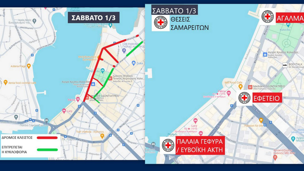 Για την ασφάλεια πολιτών και συμμετεχόντων στην παρέλαση και για περιπτώσεις έκτακτης ανάγκης, θα υπάρχουν εθελοντές του Παραρτήματος Χαλκίδας του Ελληνικού Ερυθρού Σταυρού, στα εξής σημεία:
