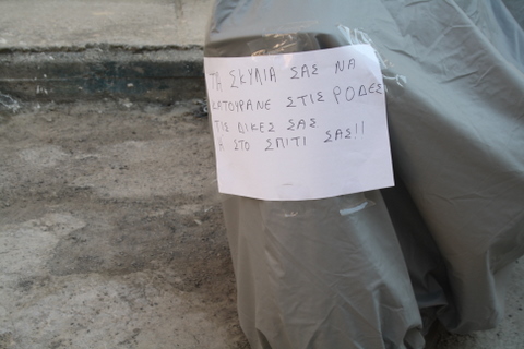 Οι σκύλοι πήγαιναν και έκαναν την ανάγκη τους πάνω στις ρόδες του αυτοκινήτου με αποτέλεσμα να τα "πάρει" ο άτυχος ιδιοκτήτης και να βάλει το ευδιάκριτο σημείωμα που φωτογραφίσαμε!