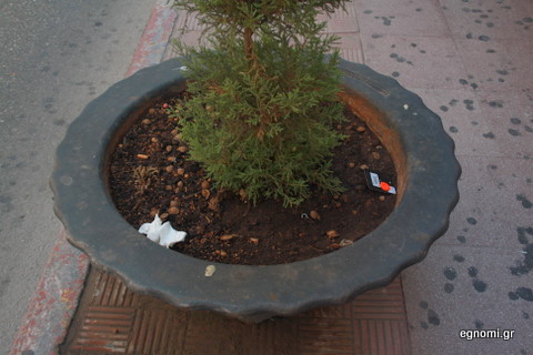 Όπως βλέπετε και στη φωτογραφία πετάνε διάφορα σκουπίδια στις γλάστρες, σα να πρόκειται για κάδους απορριμμάτων. Υπάρχει τελικά έλλειψη αισθητικής και καλής συμπεριφοράς, δεν εξηγείται αλλιώς αυτή η εικόνα.