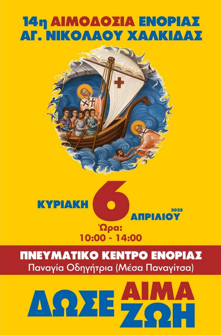 Η Ενορία Αγίου Νικολάου Χαλκίδας διοργανώνει εθελοντική αιμοδοσία, την Κυριακή 6 Απριλίου, από τις 10 το πρωί μέχρι τις 2 το μεσημέρι, για την ενίσχυση της Τράπεζας Αίματος.
