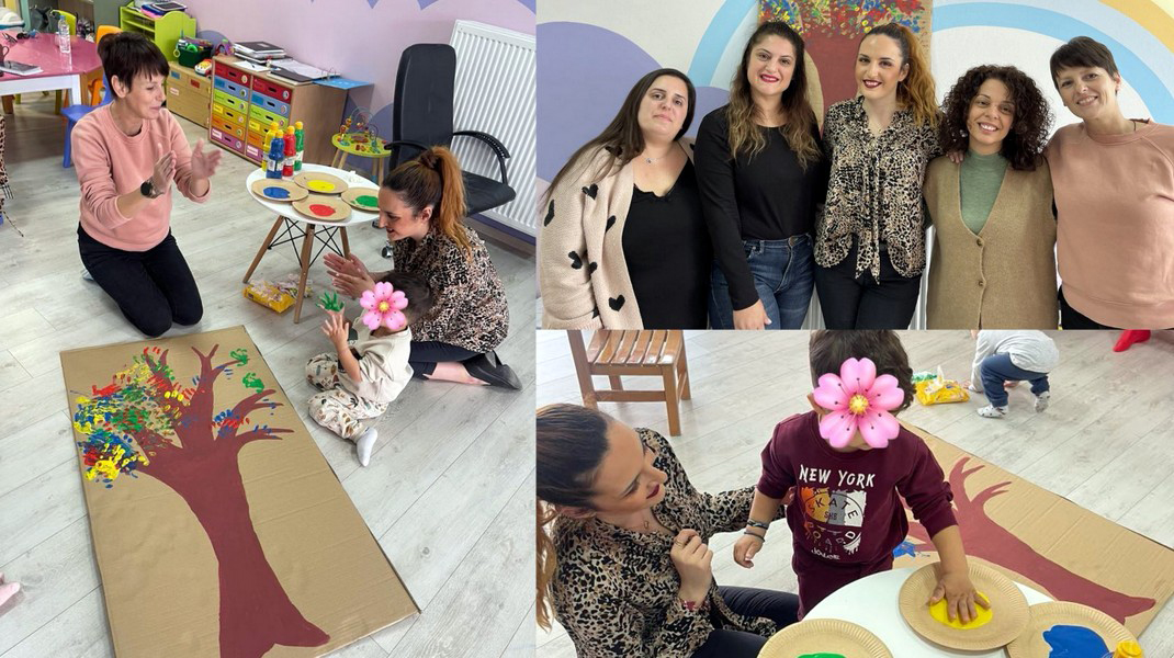 Η δραστηριότητα με τη μπογιά προσέφερε μια αισθητηριακή εμπειρία, όπου τα παιδιά βυθίστηκαν τις παλάμες τους στο χρώμα και δημιούργησαν τα φύλλα του δέντρου.