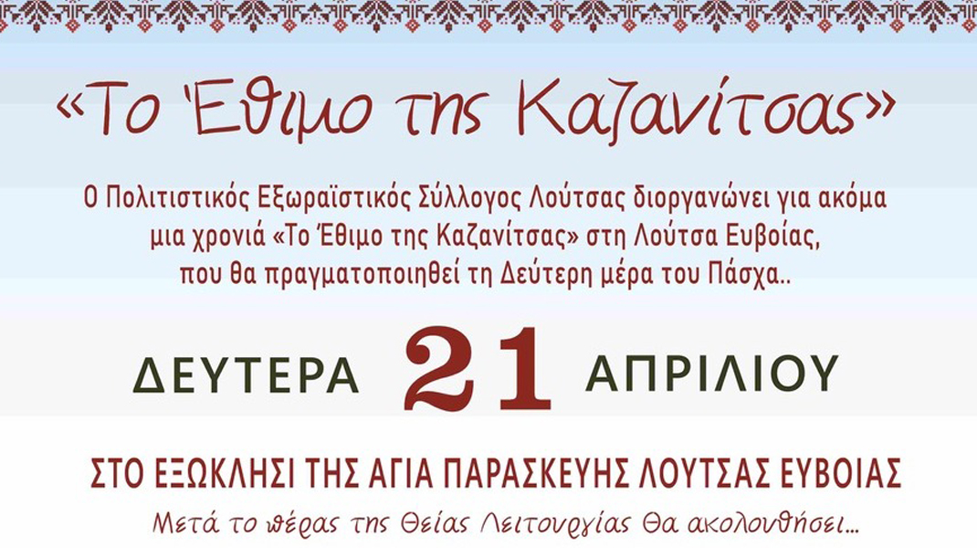 Ο Πολιτιστικός Εξωραϊστικός Σύλλογος Λούτσας, του Συλλόγου Διρφύων- Μεσσαπίων αναβιώνει το έθιμο της Καζανίτσας, την Δευτέρα του Πάσχα 21 Απριλίου, στο εκκλησάκι της Αγίας Παρασκευής.