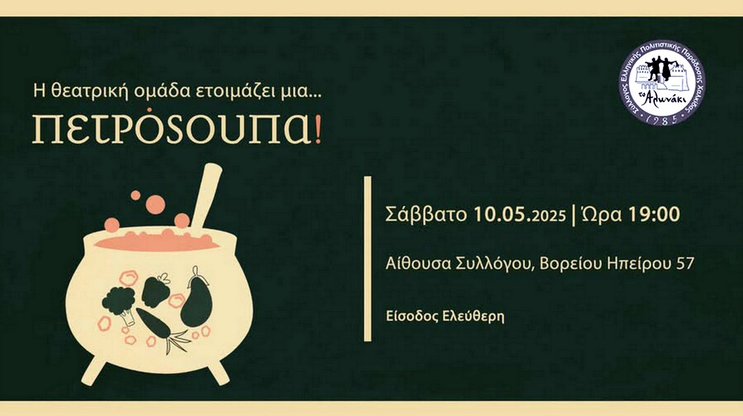 Ο Σύλλογος Πολιτιστικής Παράδοσης Χαλκίδας «Το Αλωνάκι» παρουσιάζει την θεατρική παράσταση “Πετρόσουπα” για μικρούς και μεγάλους, το Σάββατο 10 Μαΐου, στις 7 το απόγευμα, στην Κεντρική αίθουσα του Συλλόγου ( Βορείου Ηπείρου 57).