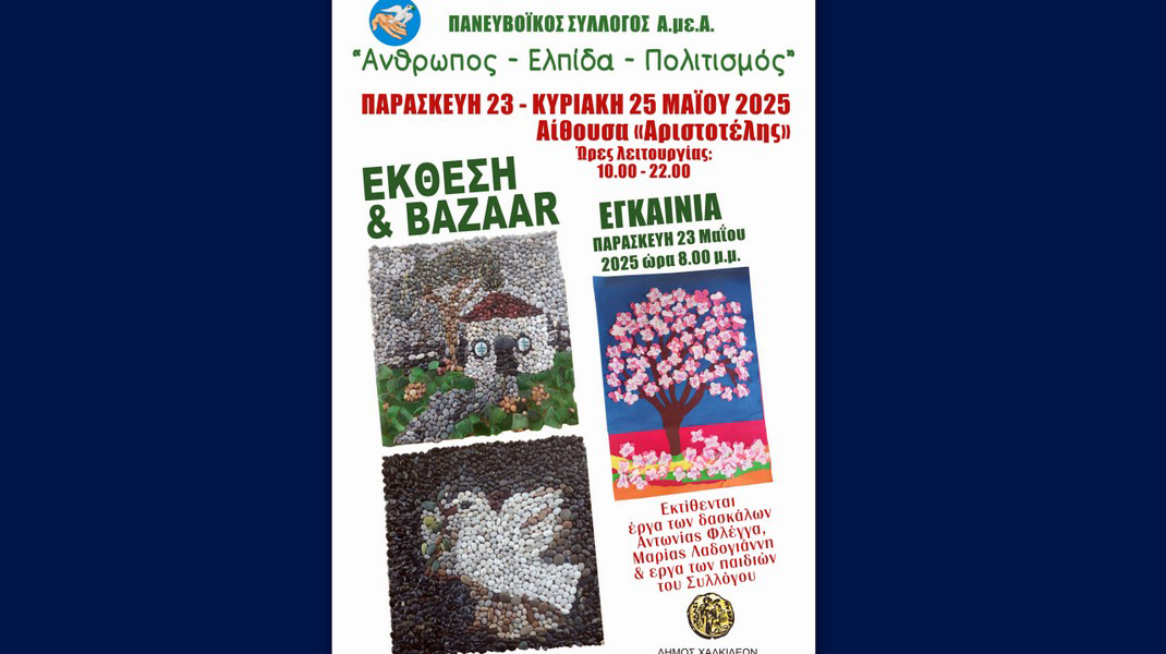 Ο Πανευβοϊκός Σύλλογος Γονέων , Κηδεμόνων και Φίλων Α.με.Α "Άνθρωπος - Ελπίδα – Πολιτισμός" διοργανώνει Εικαστική Έκθεση και Bazaar στην ισόγεια αίθουσα "Αριστοτέλης " του Δημαρχείου (Μέγαρο Κότσικα).