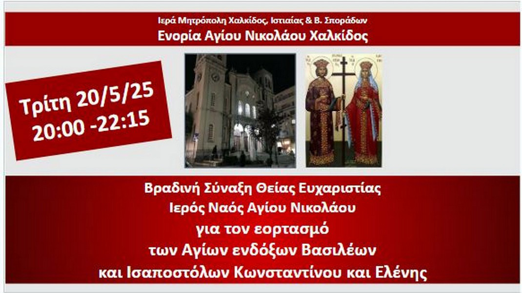 Βραδινή Σύναξη Θείας Ευαριστίας θα τελεστεί την Τρίτη 20 Μαΐου, στον ιερό ναό Αγίου Νικολάου Χαλκίδας, για τον εορτασμό των Αγίων Ισαποστόλων Κωνσταντίνου και Ελένης.