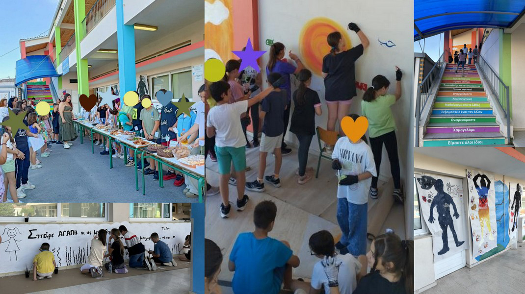 - Ζωγραφική στους τοίχους του σχολείου με συμμετοχή όλης της κοινότητας (μαθητές, γονείς, εκπαιδευτικοί). Στον έναν τοίχο αποτυπώθηκαν οι στίχοι του Σ. Ποταμίτη και στον άλλον γράφτηκε μέσα στον ήλιο η λέξη αγάπη και γύρω της η ίδια λέξη σε διάφορες γλώσσες του κόσμου.