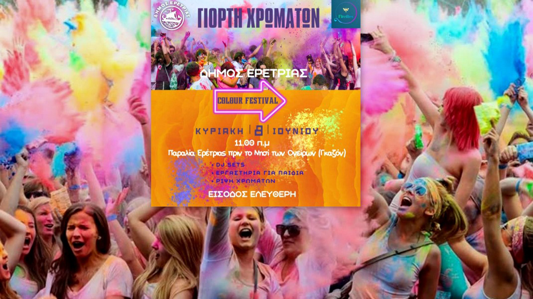 Με πρωτοβουλία του Δήμου Ερέτριας, σε συνεργασία με την Fireflies Fest, θα πραγματοποιηθεί Φεστιβάλ Χρωμάτων, την Κυριακή 8 Ιουνίου, στις 11 το πρωί, στην παραλία Ερέτριας, λίγο πριν το Νησί των Ονείρων (γκαζόν).