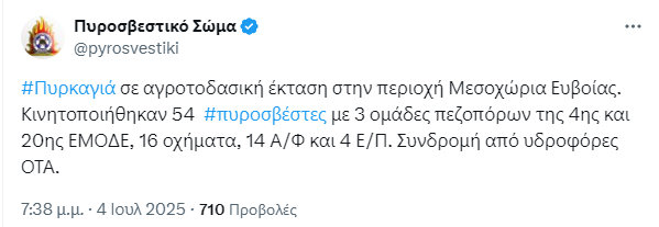 Φωτιά, που έλαβε γρήγορα διαστάσεις, λόγω των ισχυρών ανέμων, ξέσπασε το απόγευμα της Παρασκευής 4 Ιουλίου, στα Μεσοχώρια του Δήμου Καρύστου, σε αγροτοδασική έκταση.