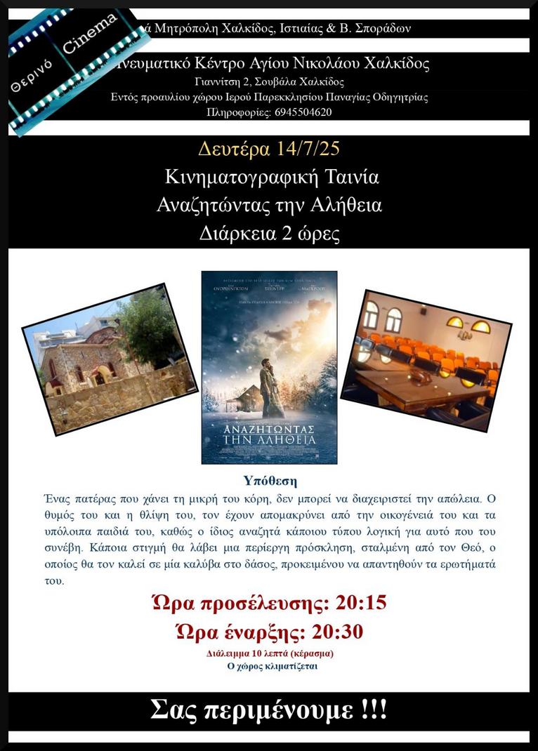 Η προβολή της ταινίας "Αναζητώντας την αλήθεια" θα πραγματοποιηθεί την Δευτέρα 14 Ιουλίου, με ώρα έναρξης στις 8:30 το βράδυ, στο Πνευματικό Κέντρο της Ενορίας Αγίου Νικολάου Χαλκίδας.