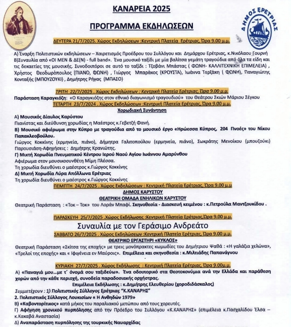 Ο Πολιτιστικός Σύλλογος Ερέτριας "Κ. Κανάρης" διοργανώνει και φέτος τις πολιτιστικές εκδηλώσεις με την ονομασία "Κανάρεια 2025", οι οποίες αρχίζουν την Δευτέρα 21 και θα ολοκληρωθούν την Κυριακή 27 Ιουλίου.