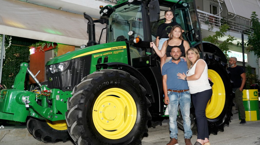 Το ζευγάρι μαζί με τις κόρες τους καμαρώνουν πάνω στον νέο ελκυστήρα.