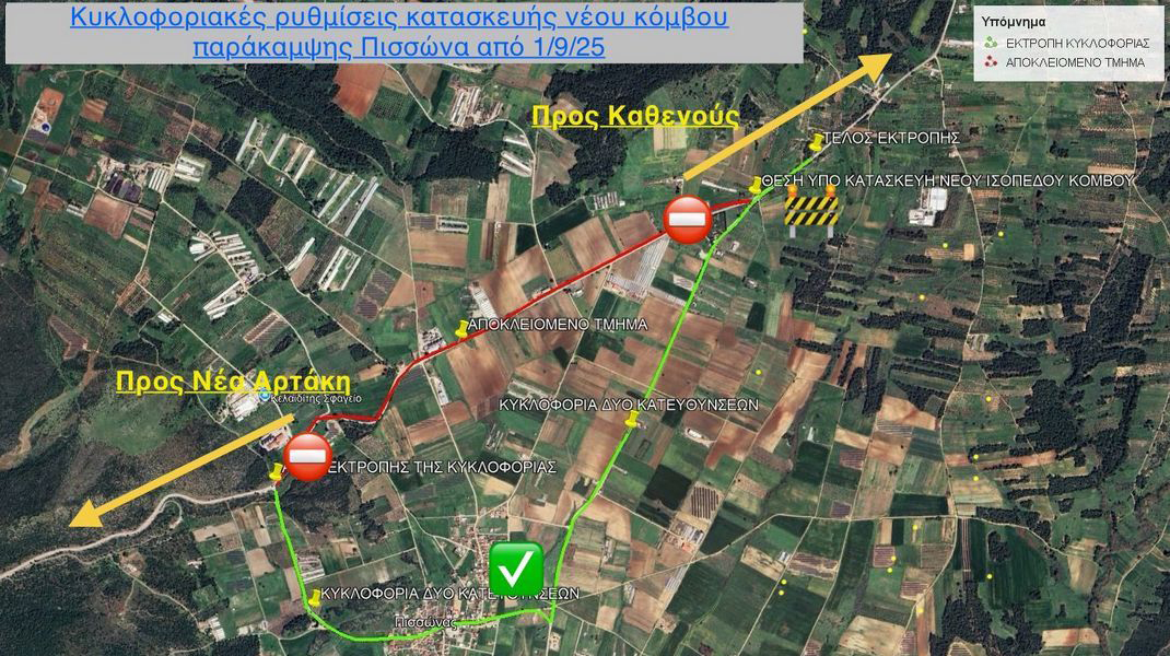 Στο πλαίσιο εκτέλεσης έργου αποκατάστασης ζημιών στον επαρχιακό δρόμο, θα γίνει εφαρμογή προσωρινών κυκλοφοριακών ρυθμίσεων εργοταξιακού χαρακτήρα για την κατασκευή του νέου κόμβου της παράκαμψης του οικισμού Πισσώνα.