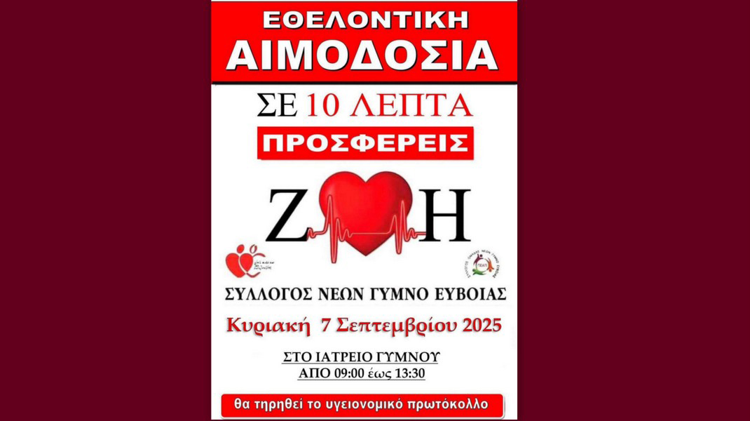 Ο Σύλλογος Νέων, στο Γυμνό του Δήμου Ερέτριας, διοργανώνει εθελοντική αιμοδοσία την Κυριακή 7 Σεπτεμβρίου, στο Ιατρείο της κοινότητας, από τις 9 το πρωί μέχρι την 1:30 το μεσημέρι.