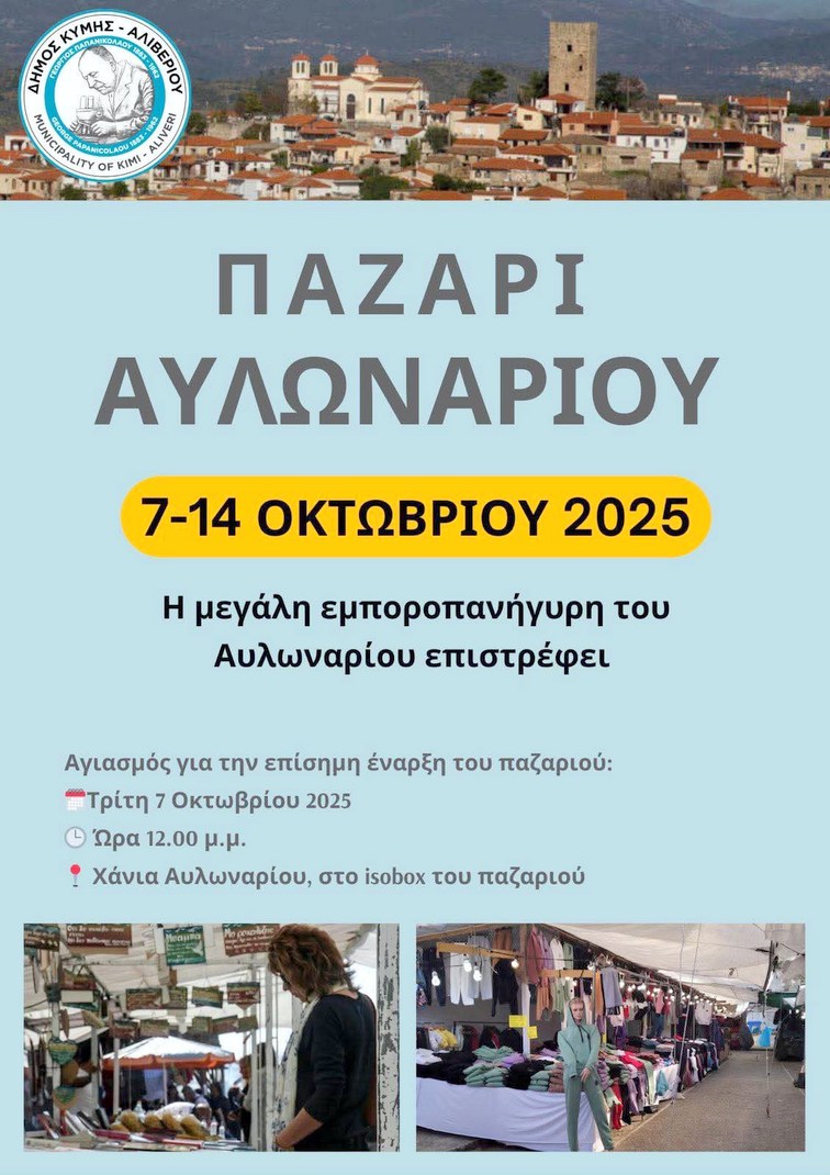 Ο Δήμος Κύμης - ΑΛιβερίου καλεί όλο τον κόσμο να επισκεφτεί το παζάρι Αυλωναρίου, να στηρίξει τους τοπικούς παραγωγούς και εμπόρους, να ανακαλύψει μοναδικές προσφορές και να ζήσει τη ζεστή και φιλόξενη ατμόσφαιρα αυτής της παραδοσιακής γιορτής.