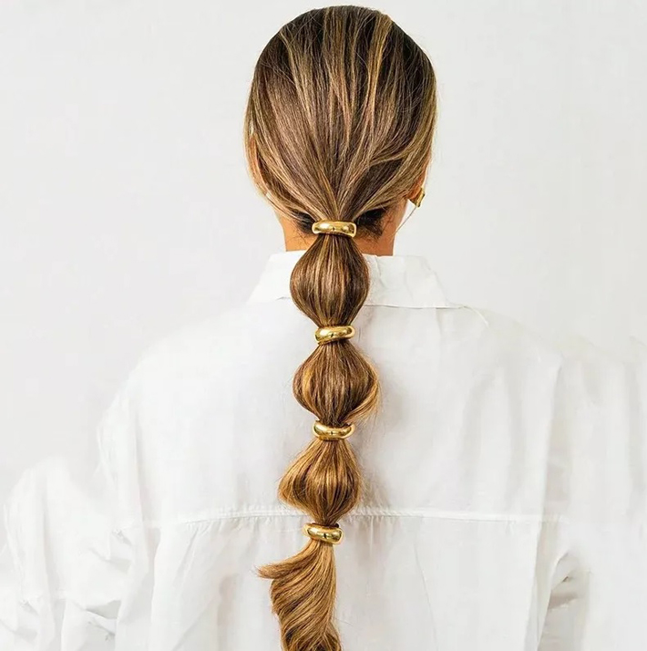 Η κλασική αλογοουρά γίνεται glamorous με λίγα χρυσά κλιπ. Αφού δέσεις τα μαλλιά σε ponytail, πρόσθεσε μερικά διακοσμητικά κλιπ στο πλάι ή στη βάση και το χτένισμα αποκτά αμέσως στυλ. Ιδανικό για μέρες με υγρασία, γιατί κρατάει τα μαλλιά μακριά από το πρόσωπο και παραμένει τέλειο για ώρες.