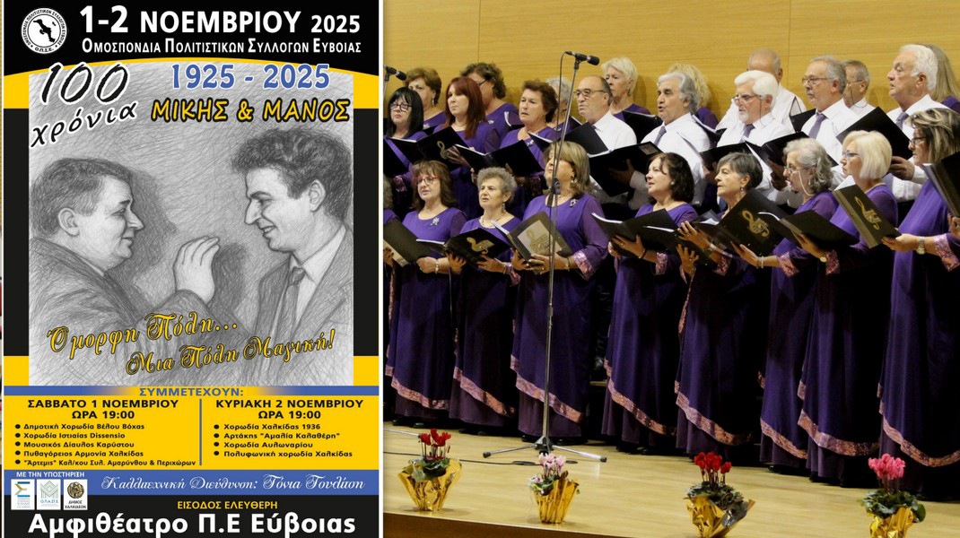 Η Ομοσπονδία Πολιτιστικών Συλλόγων Ευβοίας διοργανώνει το Σάββατο 1 και την Κυριακή 2 Νοεμβρίου, με ώρα έναρξης στις 7 το απόγευμα, διήμερο Χορωδιακό Φεστιβάλ, στο Αμφιθέατρο της Περιφερειακής Ενότητας Εύβοιας.