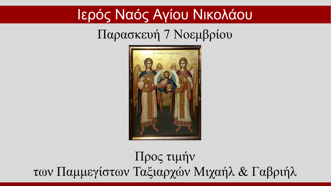 Βραδινή θεία λειτουργία θα τελεστεί στον ιερό ναό του Αγίου Νικολάου Χαλκίδας, την Παρασκευή 7 Νοεμβρίου, παραμονή της Σύναξης των Παμμεγίστων Ταξιαρχών Μιχαήλ και Γαβριήλ.